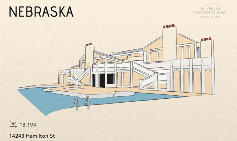 Located in the posh Omaha neighborhood of Linden Estates, the largest home in Nebraska boasts four bedrooms, 13 bathrooms, a two-story foyer, an exercise room, a bowling lane, and an infinity pool.