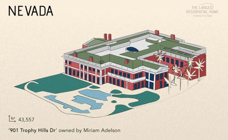 One of the newer homes to rank as the largest within a state, the mansion at 901 Trophy Hills Drive was built in 2013 on 2.5 acres of land and contains eight bedrooms and 19 full bathrooms. The mansion was built by the late casino billionaire and political donor Sheldon Adelson and is now owned by his widow Miriam Adelson.