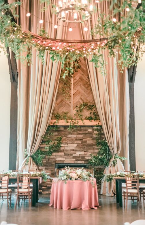 Pricing for Saturday weddings is $6,000 and includes the décor already in place. A glimmering chandelier hangs above the underground reception space. Eight panels of white drapery and lights extend out from the chandelier and fall to the floor from the columns of the Historic Cavern Nite Club pavilion.