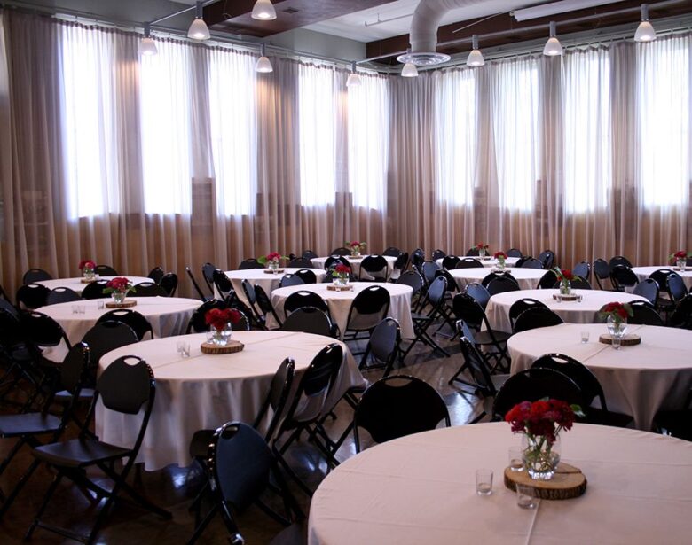 Located in a former furniture factory, the living room has 3,500 square feet of flexible-use space for events. The Living Room provides a unique industrial backdrop for your event. Flexible spaces allow you to divide or expand your event as needed. Custom floor plans utilize their comfortable and sleek banquet furniture. The pre-installed audio-visual system, commercial staging kitchen, and ample parking meet all your event needs! Smaller intimate weddings start around $1,500.