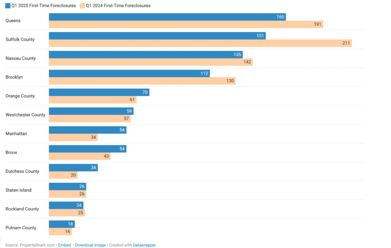 See how first-time foreclosures evolved in Q1 2025 across metro New York