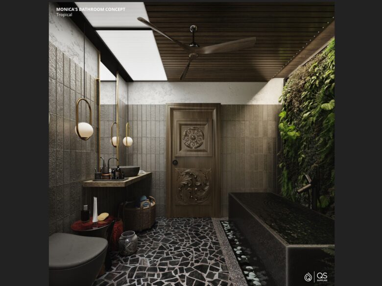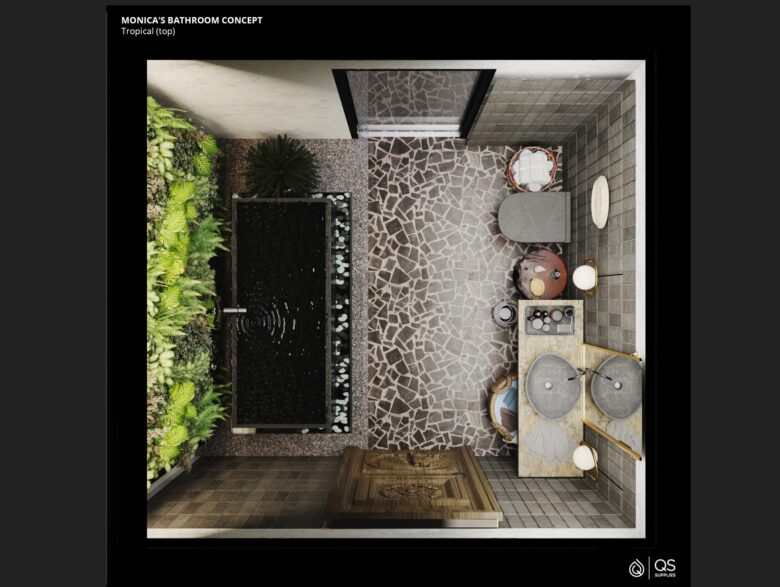 Tip: Don’t over-clutter – instead, double down on mirrors and humidity-chomping houseplants to give yourself the feeling of being lost in paradise.