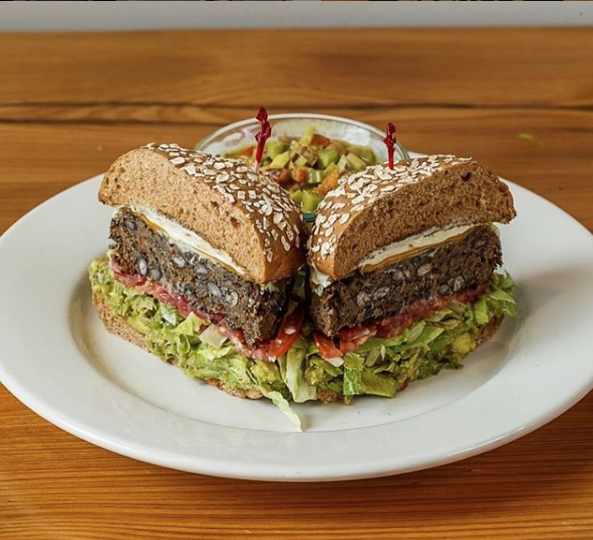 Details: This artsy cafe has a wide variety of healthy veggie options on the menu, including fried portobello quinoa tacos and a vegan meatloaf. Their veggie burger is a vegan quinoa black bean burger, served with spicy mayo on a toasted torta bun.