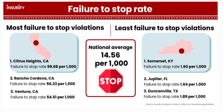 Failure to stop violations are the most common rude driving infractions. The average rate of failure to stop (at a stop sign or a red light) in cities across the nation is 14.56 per 1,000 drivers. Nationwide, Citrus Heights, California has the highest share of drivers with at least one failure to stop violation on their record, at 76% greater than the national average. Somerset, Kentucky, where the most polite drivers in the nation live, has the lowest rate of failure to stop violations, at 89% lower than the national average.