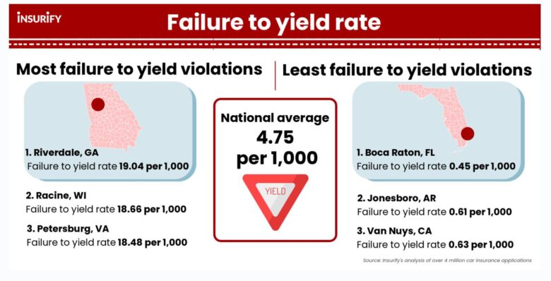 The second-most common rude driving infraction is failure to yield, and across U.S. cities, drivers on average are cited for this violation at a rate of 4.75 per 1,000 drivers. Drivers in Riverdale, Georgia have the highest failure to yield rate in the nation at 75% greater than the national average. Boca Raton, Florida has the lowest failure to yield violation rate; Boca Raton drivers are cited for failing to yield 91% less frequently than the average American driver.