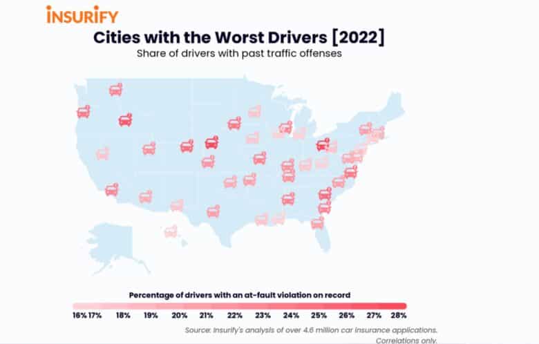 While not all moving violations are equally hazardous, every infraction — from improper backing to reckless driving — represents some level of neglect for the rules of the road. Curious to see where drivers break traffic laws most often, the data scientists at Insurify turned to their database of over 4.6 million car insurance applications to identify the city in each state with the worst drivers in 2022.