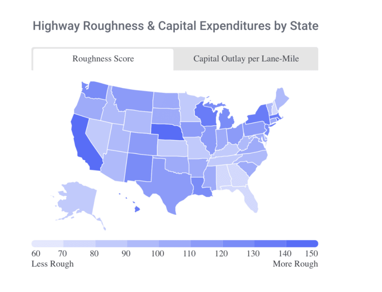 - Road Roughness Index: We developed a composite roughness score of all major urban roadways in each state by weighting each category of measured pavement roughness and aggregating this information across the entire state system.