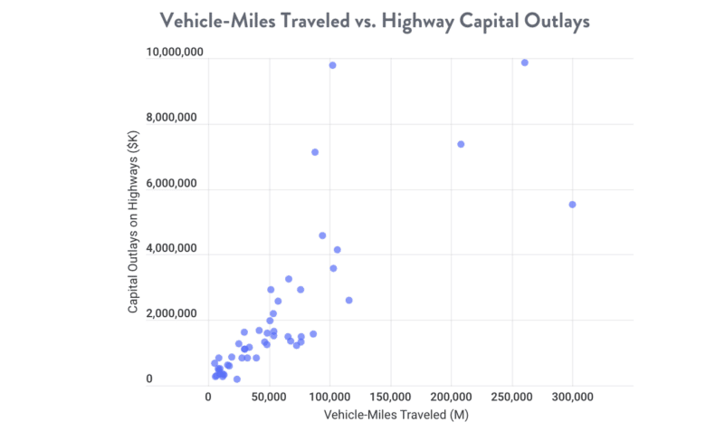 - Capital Outlays per Lane Mile: This value is calculated as the total state expenditure on capital outlays for highways divided by the total lane miles in each state’s functional road system.