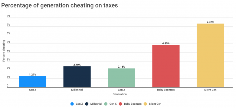 According to our survey, roughly 7.3% of the silent generation says they cheat on their taxes. Following this generation is 4.9% of baby boomers, with millennials bucking the trend at 2.4%.