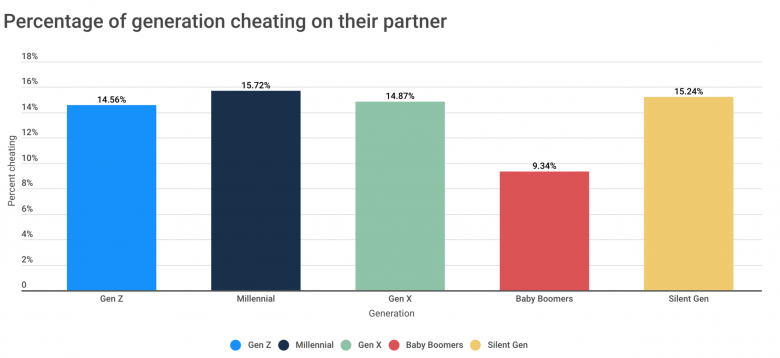 As with the genders, cheating on your significant other is the great unifier, with more than 14% of Gen X and Gen Y admitting to cheating on their partner and over 15% of Gen Z and the silent generation saying the same. The only, ahem, loyal generation appears to be baby boomers, of which only 9.3% admit to stepping out on their relationship.
