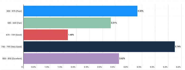 That said, people with very good credit scores are most likely to cheat on their taxes (5.74%), while those with good credit scores are least likely to do so (1.68%).