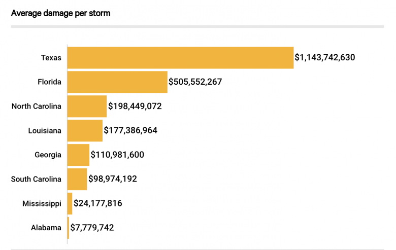 Despite the frequency of hurricanes that struck Florida during this time, Texas actually had the highest average amount of damage per disaster: $1.1 billion. This was thanks, in large part, to Hurricane Harvey in 2017, which damaged a substantial number of homes built below FEMA’s elevation requirements.