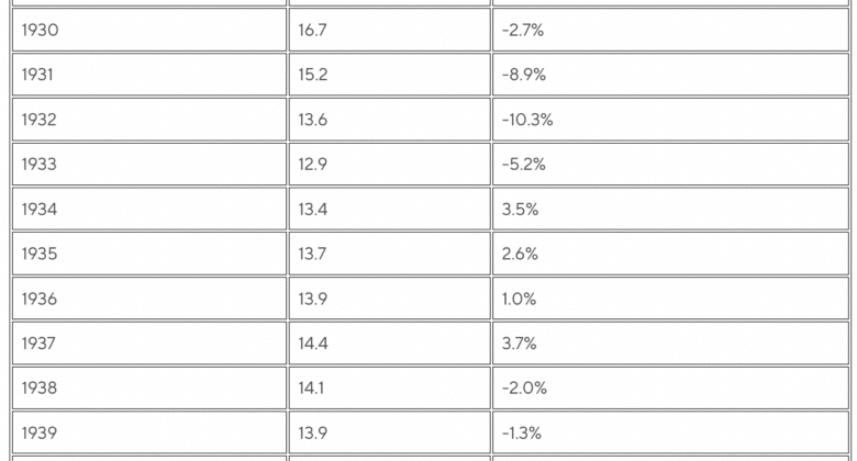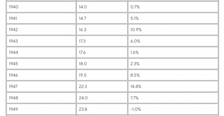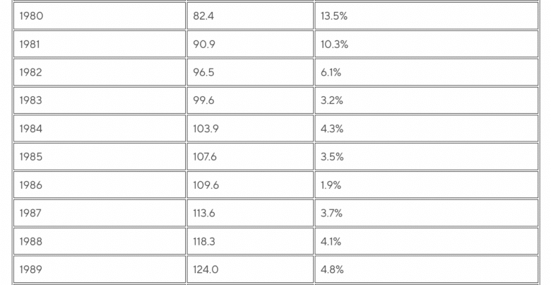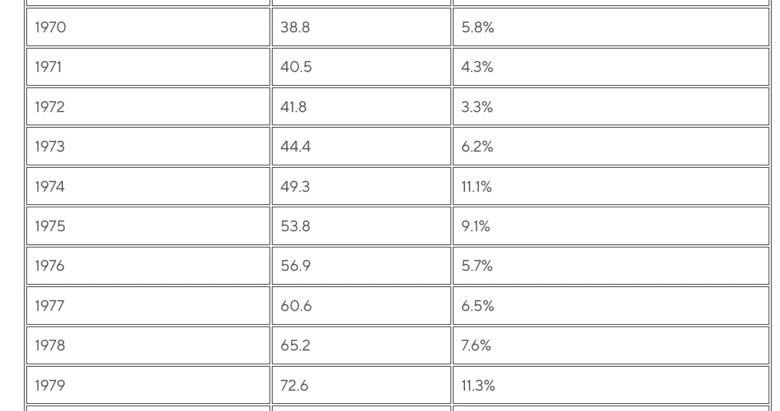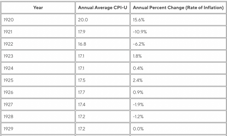 The table below shows the annual rate of inflation from 1920 to present. The first column notes the year the data was collected; the second column represents the Consumer Price Index for All Urban Consumers (CPI-U) for that year; and the third column shows the annual percent change/annual rate of inflation.