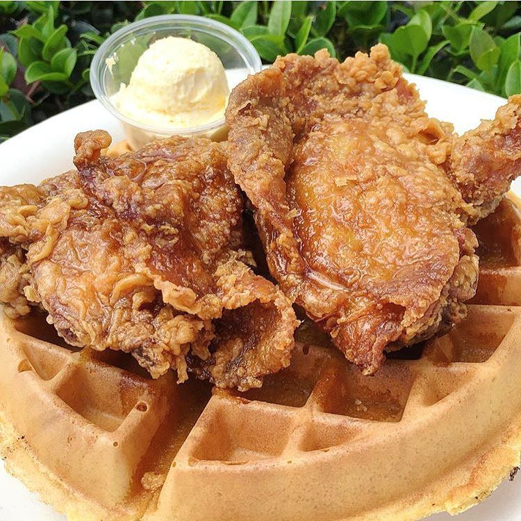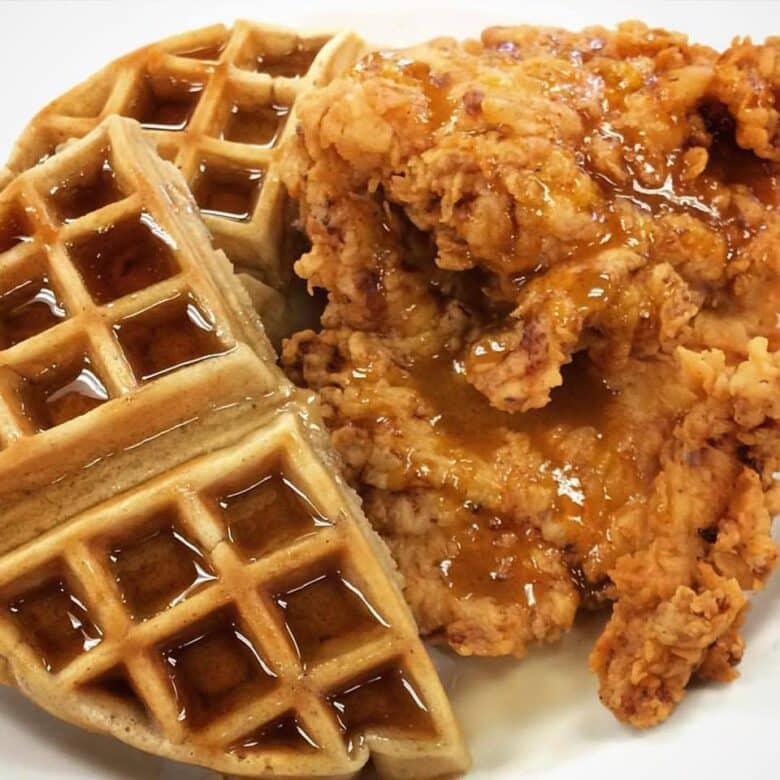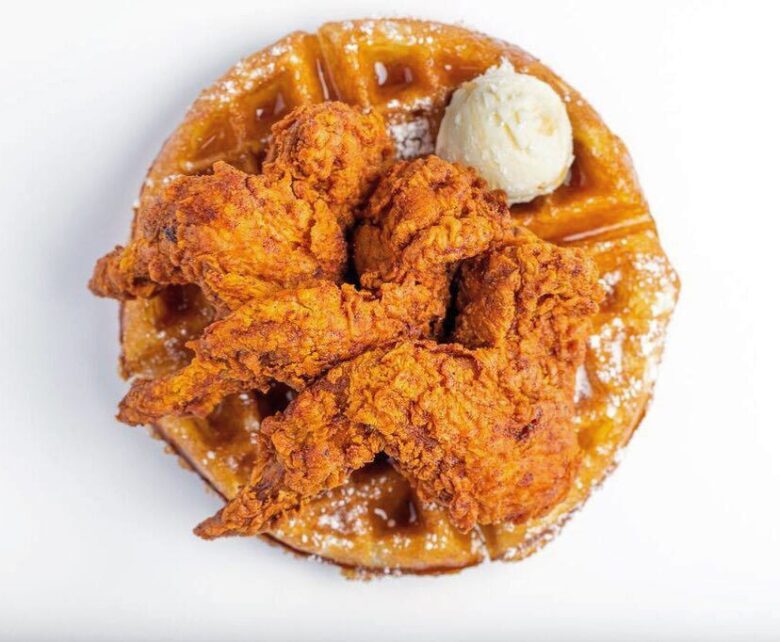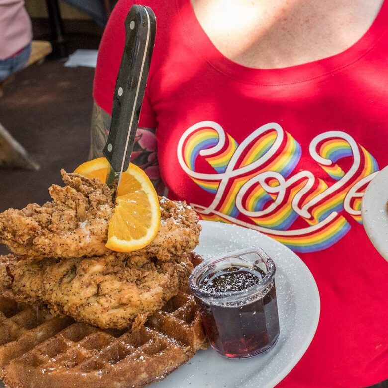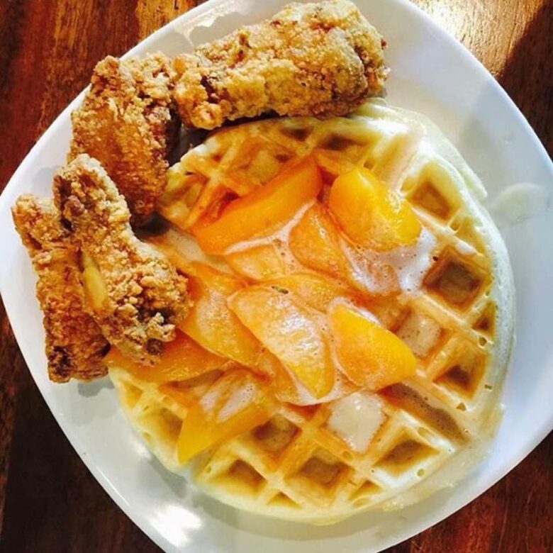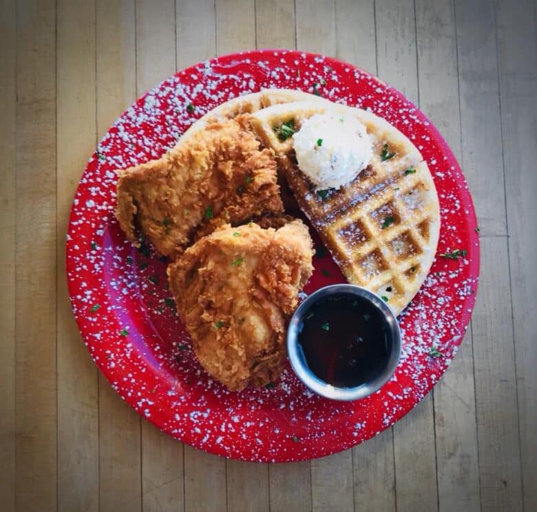 This is a restaurant known for its hipster feel, craft coffees and cocktails. What people may not know is they have well-respected chicken and waffles with names like “Southern Comfort,” a blue cornmeal waffle, buttermilk fried chicken, two eggs and topped with bourbon maple syrup. Need something a little more extra? Try the “Chicken & Waffle Stacker” consisting of buttermilk fried chicken, bacon and pepper jack cheese on a blue cornbread waffle with a side of bourbon maple syrup.
