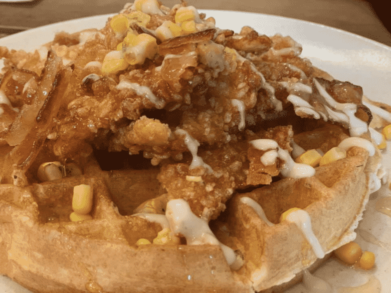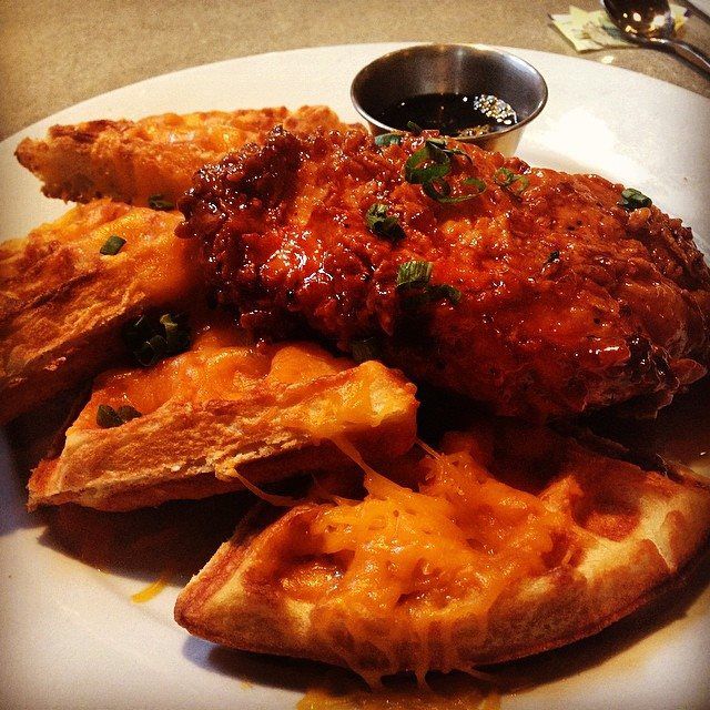 This self-proclaimed environmentally-friendly establishment aims to locally source their food whenever possible. They also serve cocktails if you’re feeling the need for a Bloody Mary or mimosa with your chicken waffles. The chicken is made with a Rice Krispies coated chicken breast and it all comes served with bacon & fire roasted poblano corn, hot honey drizzle, zesty maple sour cream and scallions.