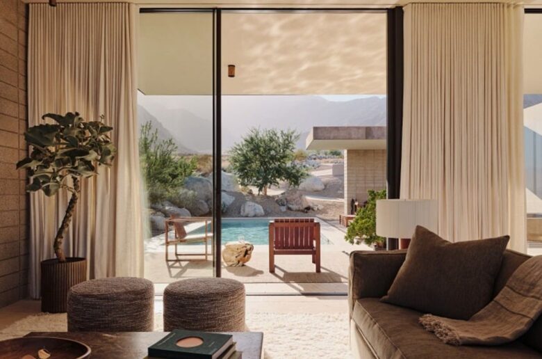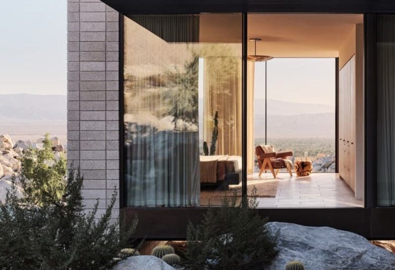 Stepping away from the traditional mid-century design that’s most commonly associated with Palm Springs homes, patinated brass panels and floor-to-ceiling glass walls line the exterior of the house.