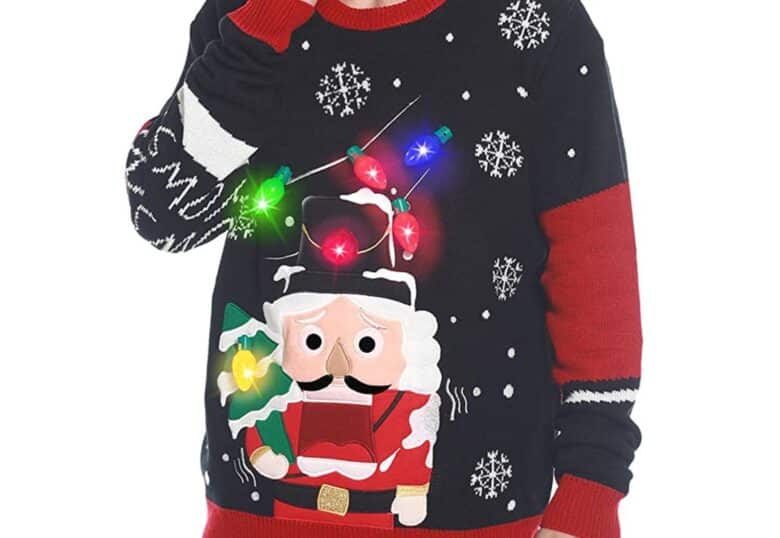 If you’re looking for a classic holiday ugly sweater, this novelty nutcracker knit may be for you. It even features 3D holiday lights that flash!