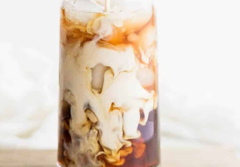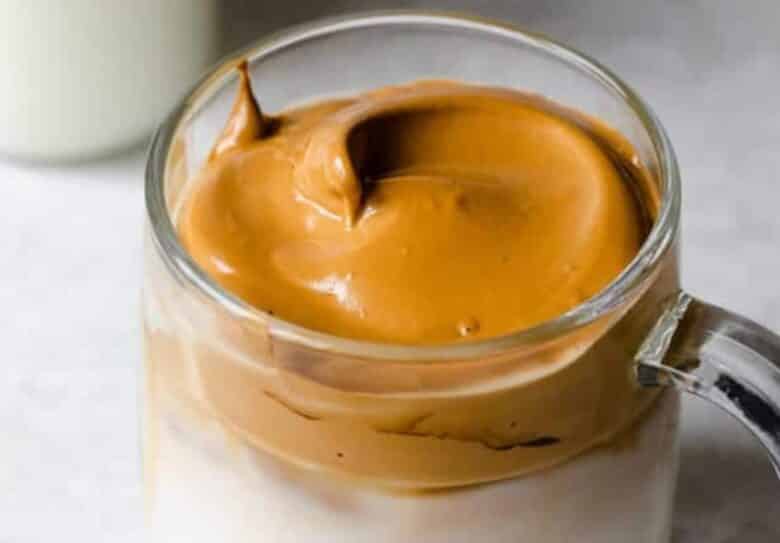 Whipped coffee is made with only three ingredients whisked together: instant coffee, sugar & water. It has a creamy, frothy mixture that’s served over iced or warmed milk.