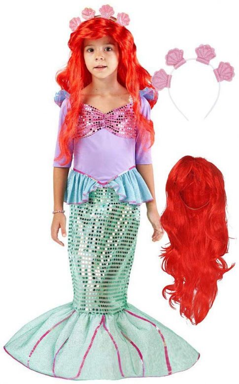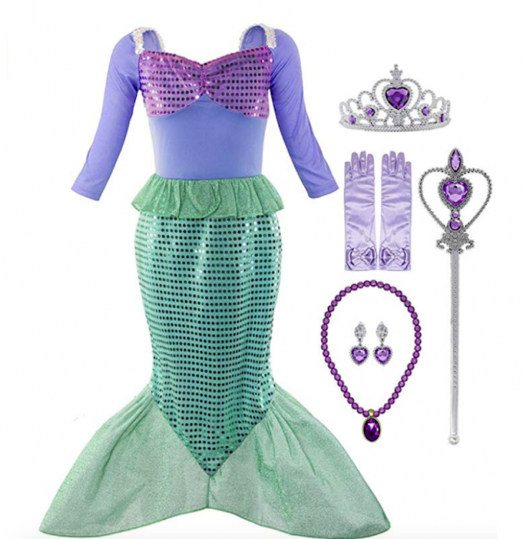 If the tyke in your life longs to live under the sea, this set has the accoutrements: your choice of mermaid dress/tail styles, plus a vibrant red wig and a seashell crown. Price: $22.99 – $26.99