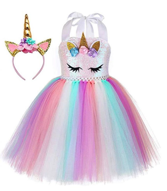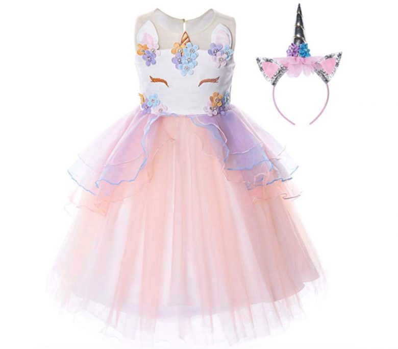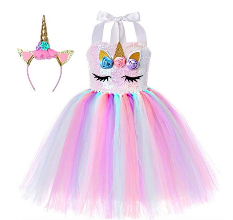 This flower-adorned rainbow tutu dress and unicorn headpiece is just one of several options in this listing, including a pastel version and an ultra-princess unicorn look. Price: $18.85 – $34.22