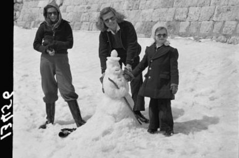 A family building a snowman, 1946.