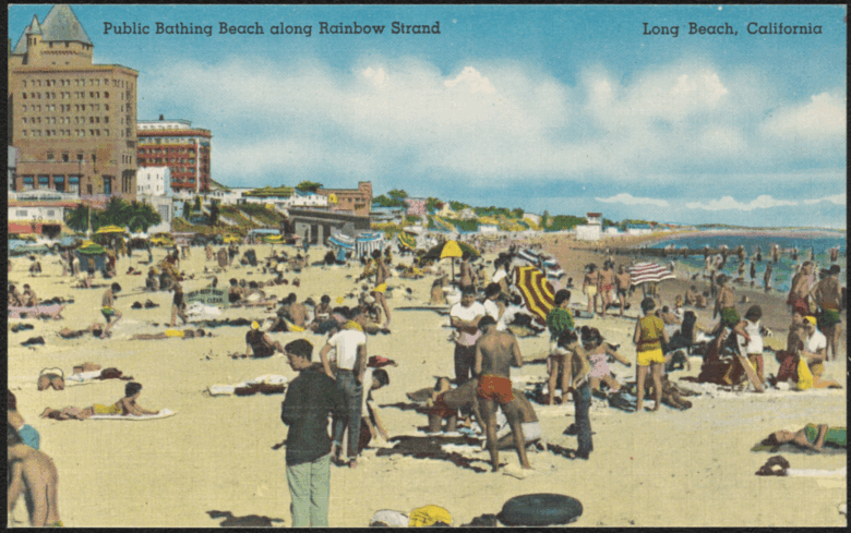 A postcard of a public bathing beach along Rainbow Strand. Long Beach, California, 1950s