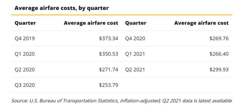 • Average airfare costs are down 19.7% from before the coronavirus pandemic. In the fourth quarter of 2019, the average cost of a ticket was $373.34. In the second quarter of 2021, the latest available data, the average cost was $299.93.