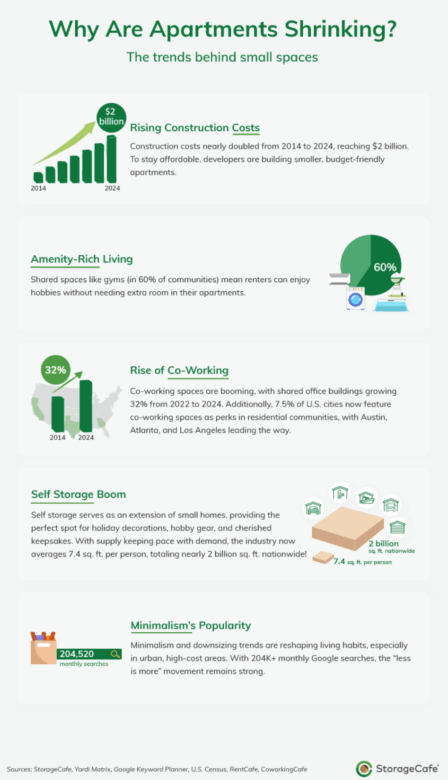 Living with less space—especially in newer apartments—has become the norm over the past decade. With demand for rentals skyrocketing, construction costs rising, and home prices reaching new heights, it’s no wonder apartments are getting smaller. But just how much space you get depends a lot on where you call home.