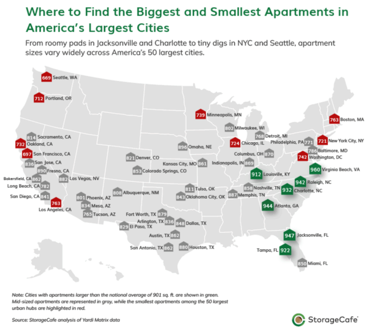 With an average of just 721 square feet, New Yorkers don’t get much room in their apartments — but they aren’t alone in facing cramped spaces. In Washington, D.C., apartments are similarly tight, averaging only 742 square feet as the city strives to accommodate an influx of young professionals and students. Apartments rent for about $3.40 per square foot, while a D.C. storage unit rents for $1.80 per square foot, providing a valuable option for those needing extra space.