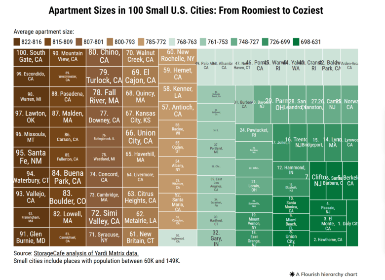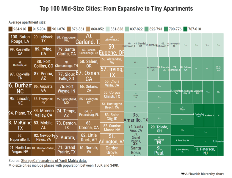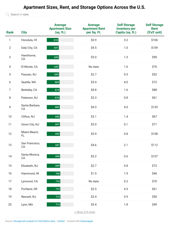 Want to see how your city compares to the rest of the U.S. in terms of living space? Here’s the complete list of 643 cities ranked by average apartment size. We’ve also included information on the existing self storage inventory per person and the price for a 5’x5’ unit that can help you manage your home more effectively.