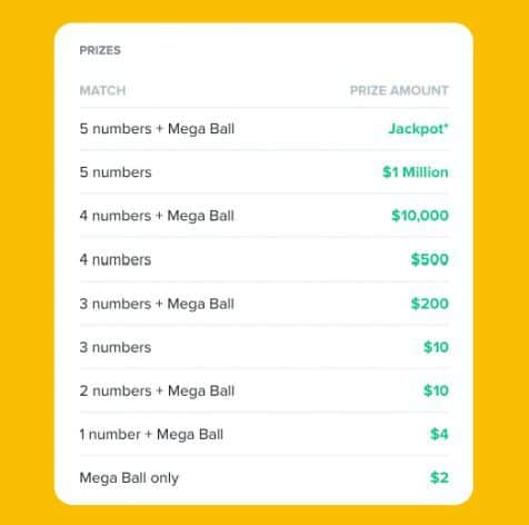 Match 2 + Mega Ball: Match two numbers and the Mega Ball to win $10. The odds of winning are one in 693.