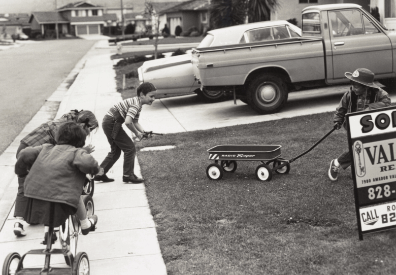 Kids enjoying their time and playing outside, around 1970.