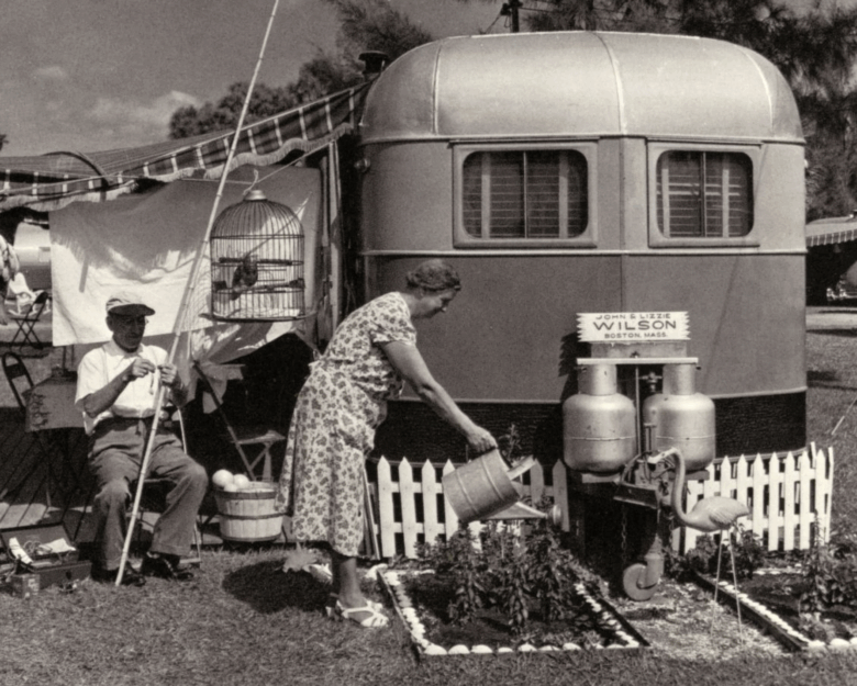 Elderly couple enjoying their time away from the city, 1951.