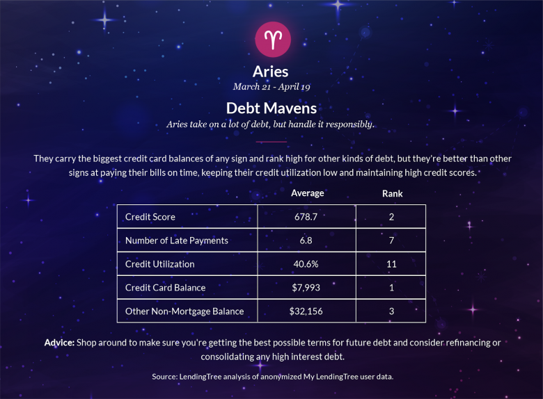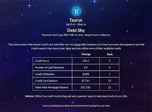 Tauruses carry the lowest average credit card balance, but that’s only $232 less than Aries, the sign with the highest average credit card balances. (OK, $232 is a lot of money when you have bills to pay.) The bull’s credit profile demonstrates that even people who don’t take on a lot of debt can have trouble paying their bills on time.