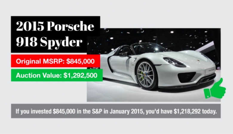There were similar results for a 1997 Porsche 993 Turbo and 2004 Porsche Carrera GT. However, the 2015 Porsche Spyder is $74,000 ahead of the S&P.