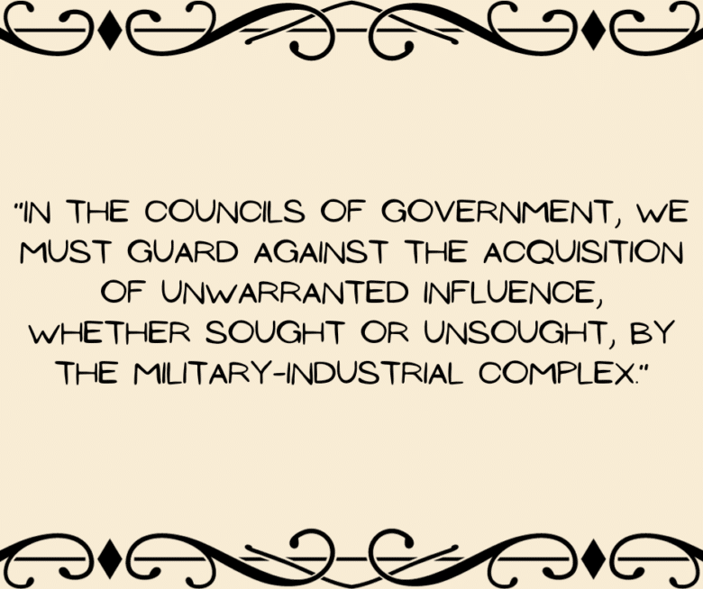 This quote comes from President Eisenhower’s farewell address in 1961, where he warned the American public about the growing power of the military-industrial complex. Eisenhower, a former general, cautioned that the convergence of military and corporate interests could unduly influence national policy and pose risks to American democracy.