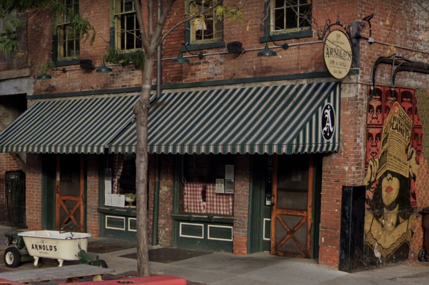 Arnold’s Bar and Grill consists of two buildings that were both created in the late 1830’s. One was originally a barber shop and the other was originally a feed store.