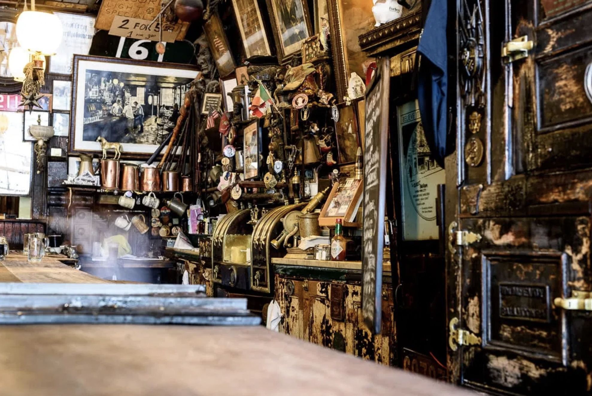 The wooden bar is an original fixture dating back to the establishment’s earliest days, along with its silver cash register. Eater gave it high marks for having a “friendly staff, a laidback clientele of varying age groups, cheap drinks and respectably decent bar fare–think wings and burgers.”